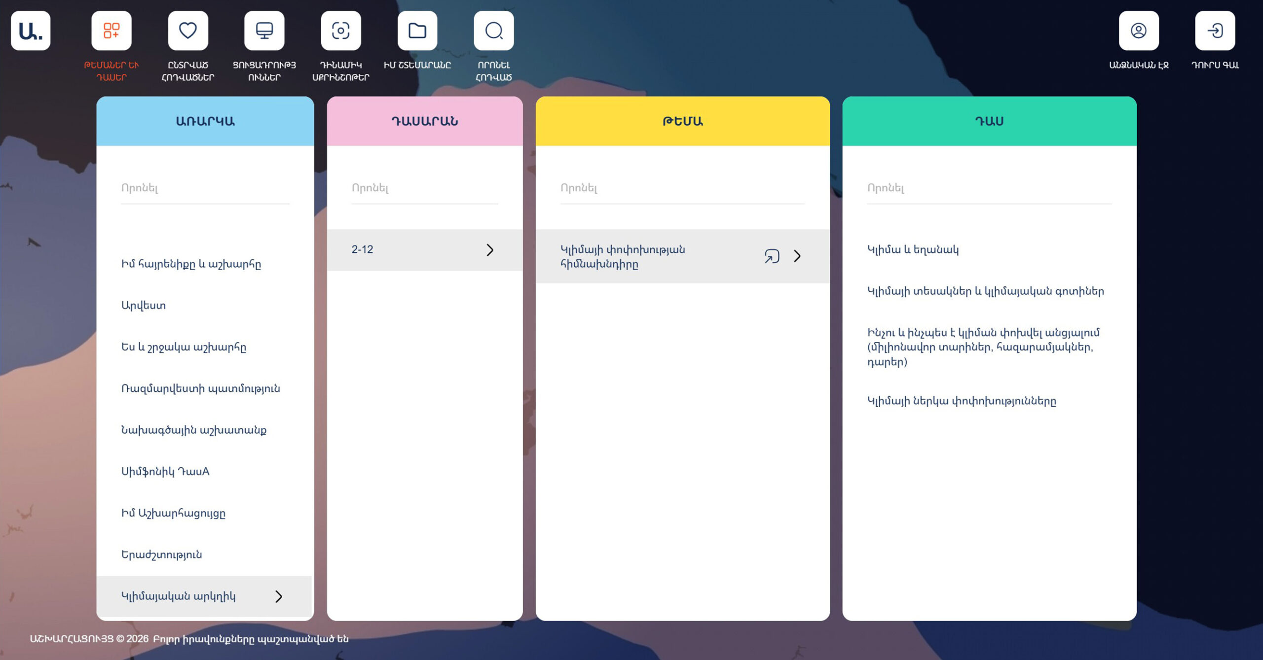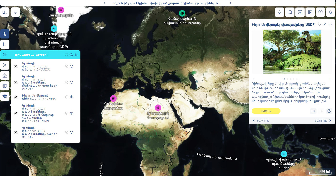 Այսուհետև հարթակում հասանելի է «Կլիմայական փոփոխության հիմնախնդիրը» թեման՝ հարստացված հատուկ մշակված քարտեզներով, ժամանակացույցով, հատուկ կատիգորիաներով, վիզուալներով, հարակից ուսումնական նյութերով և այս ամենը միջառարկայական համատեքստում ուսումնասիրելու հնարավորությամբ։